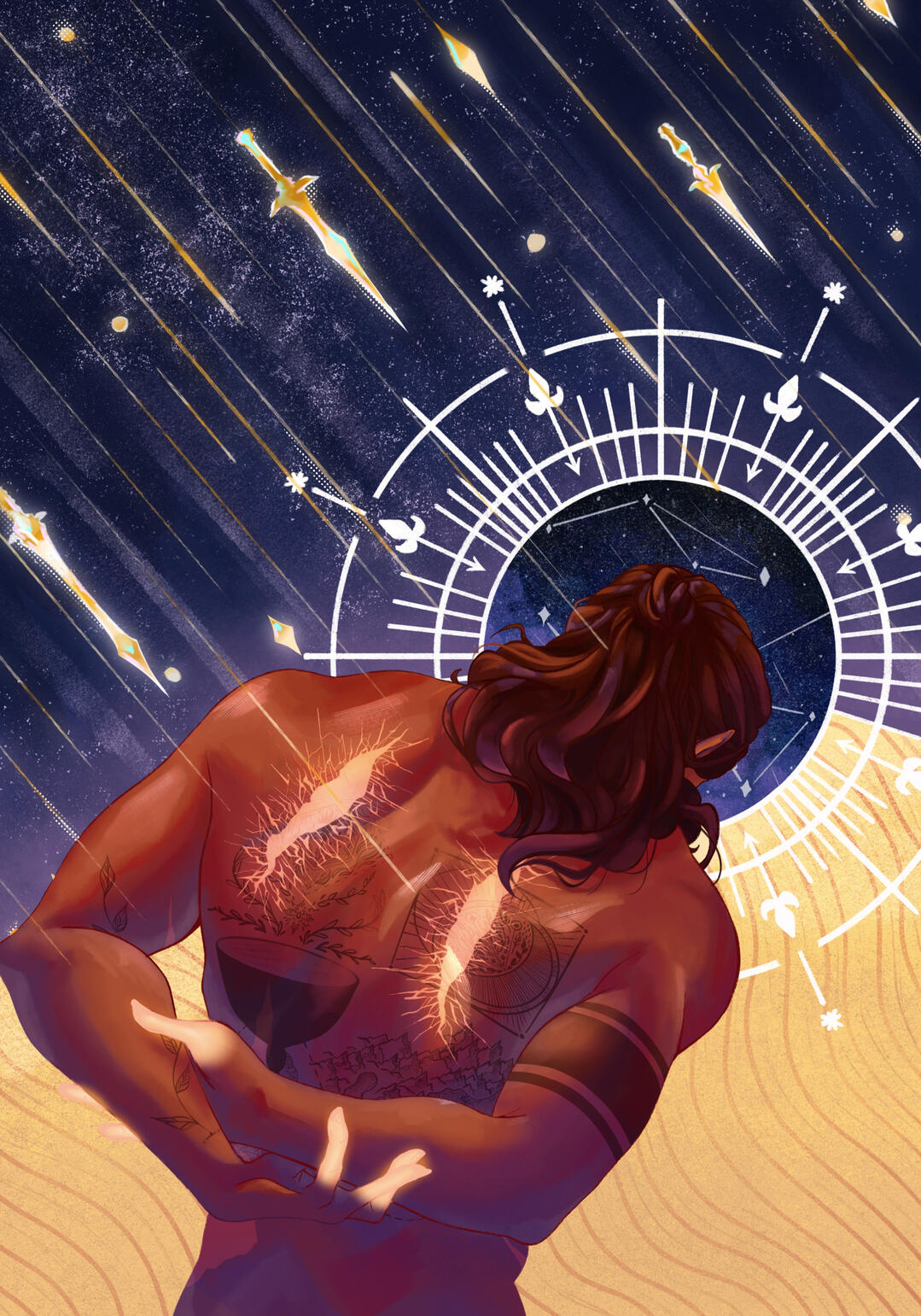 Micah grew up in a noble household in the city of Aalyvae, enjoying the life of a middle child and spending his days passing the time doing whatever he liked. He often accompanied his parents and older sister, Qirya when going to court functions. Though he didn't enjoy them, they were important in showing him how the upper court worked and how nobles tended to mask their words behind metaphors and long stories. He spent much of his time at parties and at formal court either hanging on to his siblings or spending time with Asta, his best friend. He met Asta Kassab, the prince of the city, when they were both very young and became fast friends. He also spent a good amount of time training with his uncle and mentor, Fen, to become a member of the city's guard. Though his family historically was heavily involved in fae hunting and even hoarded a large amount of artifacts and tomes speaking on the practice, Fen largely tried to keep Micah protected from it, and refused to speak on it besides giving him stories when he was exceptionally excited. Instead, Fen gently tried to steer Micah to the topic of monster hunting, which he became enamored with, trying to learn as much as he could about monsters (and fae) as he could.Eventually, he grew to be a bright young man that was truly interested in learning and knowing more about the world. One day, when he was out getting drunk, his family's home was infiltrated by people hired by Sophia, massacring his family and destroying his home. He came back to a broken home and the sole inheritor to the title. After spending a week catatonic, Micah took his family's ancestral sword and buried it beneath the staggering tree housed in their gardens, before leaving the city and traveling as a wanderer, carrying the whip that he was still training with when he left. After some time wandering in a stupor, he happened upon a druid named Xisi, a satyr that taught him in the ways of druidship. Her age was catching up to her, however, and in her dying breath she bequeathed to Micah an opal-esque stone that upon contact, seared a tattoo into his back and shattered into dust. Now Micah seeks to know what this tattoo means... and why it looks strangely like a map.